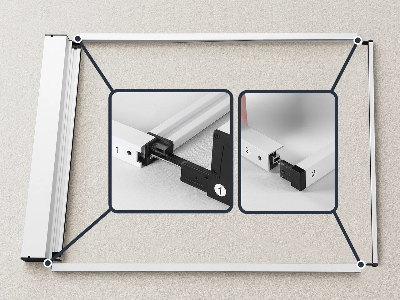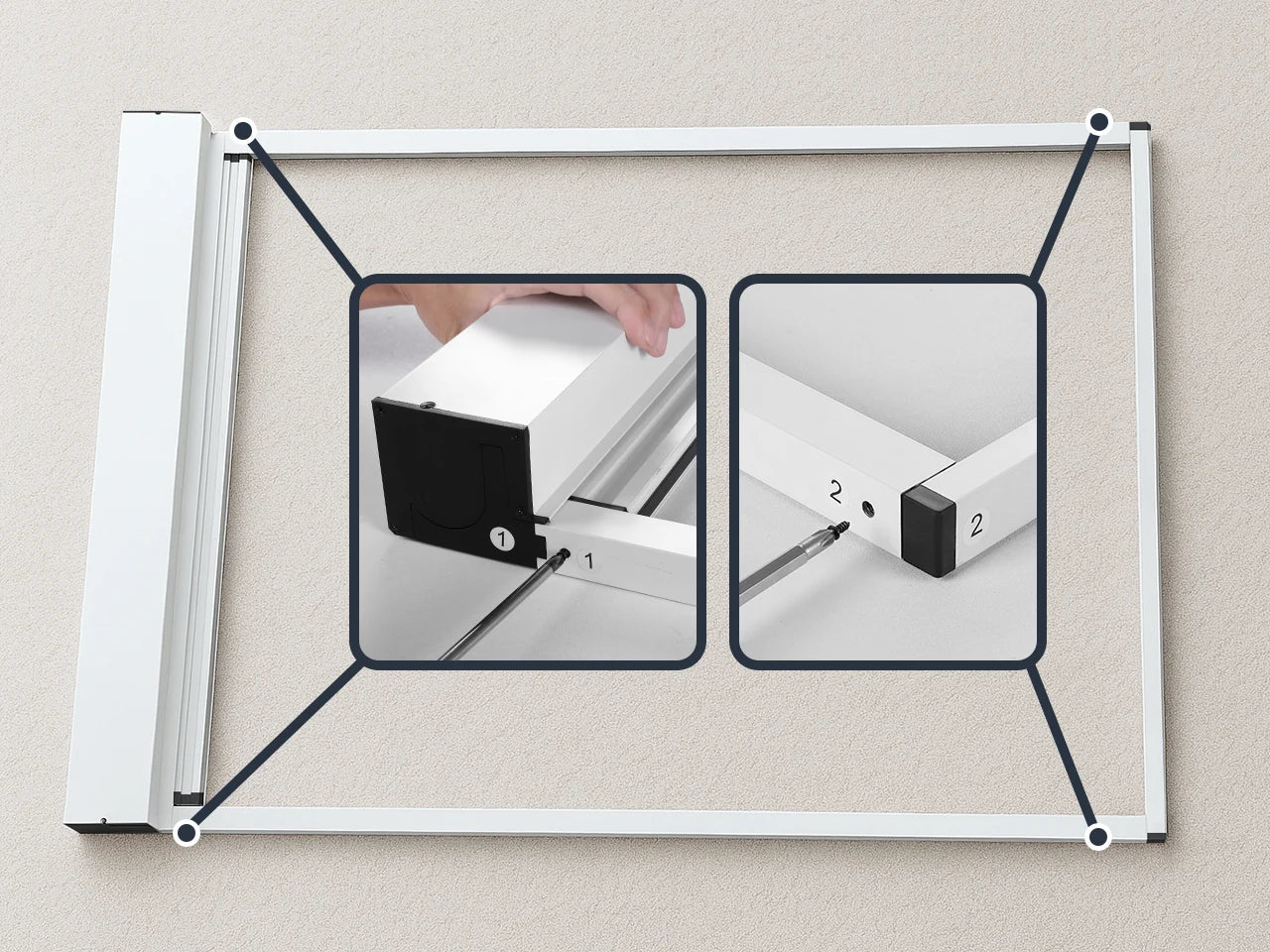 Attach one frame connector onto one end of the frame with the fabric, then attach the other connector onto the other end.